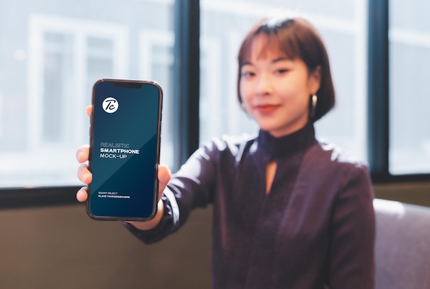 カフェでスマホ画面のモックアップを見せている女性Premium PSD。