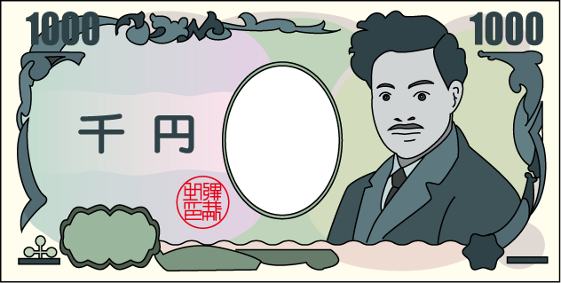 無料素材千円札を描いたフリーイラスト。デフォルメされた野口英世がかわいい雰囲気。