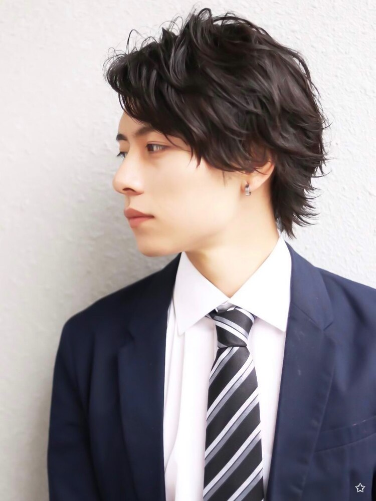 センターパート メンズパーマ メンズミディアム ビジネスヘア マッシュ マッシュウルフ スーツ丸型×ミディアムの30代 におすすめセンターパート×マッシュ×黒髪 ブラック ビジネス・オフィスヘアスタイル- OZmallヘアサロン予約。
