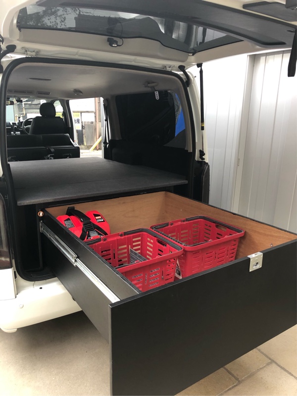 車中泊快適化 ハイエース自作ベッドキットに棚を作りました! 車中泊車中泊快適化車中泊の収納ハイエース。