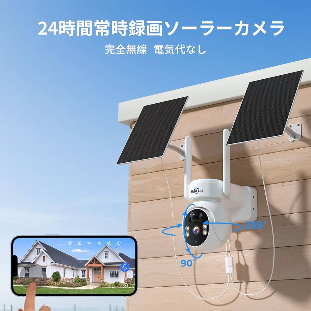 Amazon.co.jp:24時間連続録画&完全無線&ソーラーパネル付き Hiseeu 10000mAh容量・防犯カメラソーラー ワイヤレス 防犯カメラ 配線不要 400万画素 双方向音声 屋外 屋内対応 USB充電 ソーラーパネル充電可能 IP65防水 アプリ警報 動体検知 暗視夜間カラー センサー。