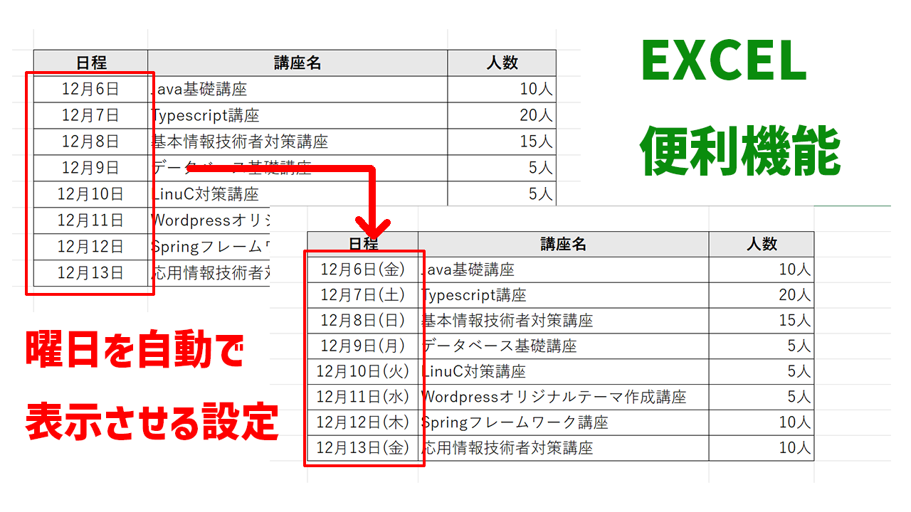 エクセル 日付から曜日を自動で入力する3つの方法。 土 や土曜日など10パターンの変換Excelの森。
