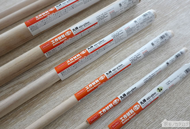 100均・木製丸棒の商品一覧。工作材料のセット本数とサイズ ダイソーとセリアで100円。