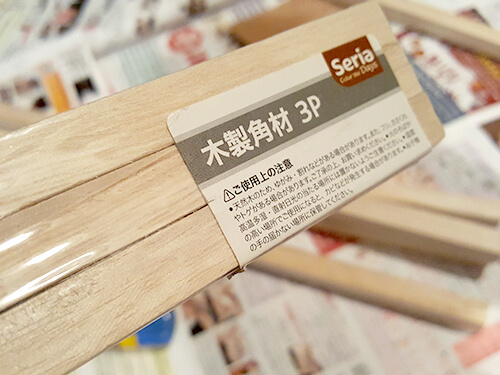 100均セリア・木製角材の商品一覧。サイズとセット本数 100円。