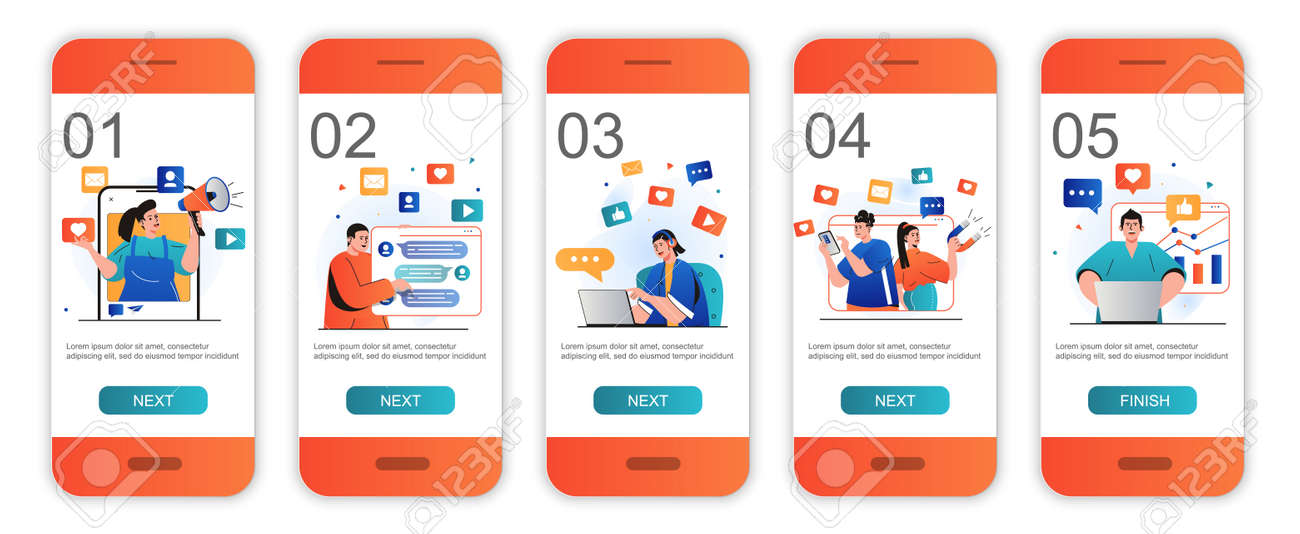 共創参加者と概念設計を特徴とするオンボーディング モバイル アプリ画面 ベクターイラストテンプレート素材PSDダウンロード。