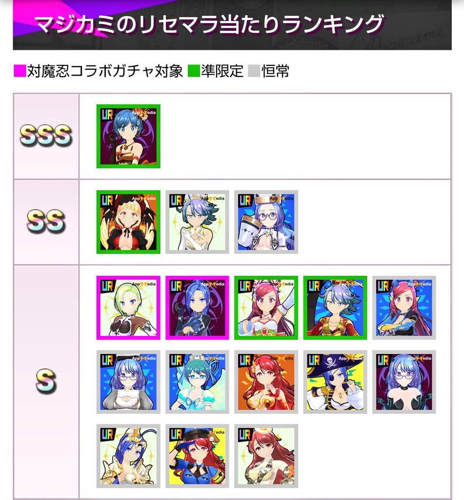 🌸アヤコさん🌸 on X: " マジカミ のリセマラランキングです リセマラ大変なので お時間あればて🌷 SSSのメルティー花織も出るんですね鬼神の強さです🍀 SSもSも当たり多いですが 個人的にBの2番目,3番目の リヴァイアサンいこ凶悪全体攻撃2種 アクーマ女幹部蒼回転。