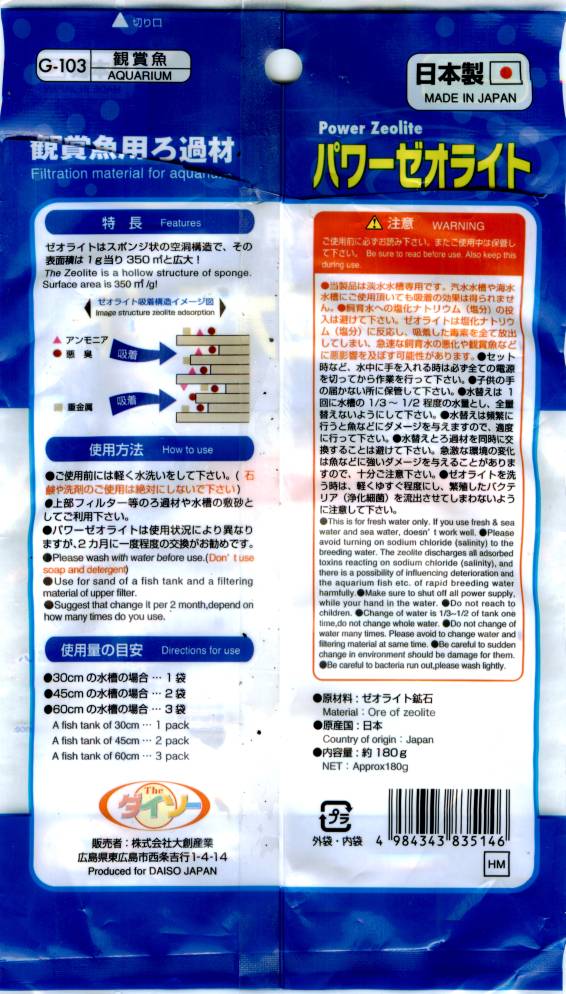 ダイソー ろ過シエル・パワーゼオライトずっと飼育栽培委員会。