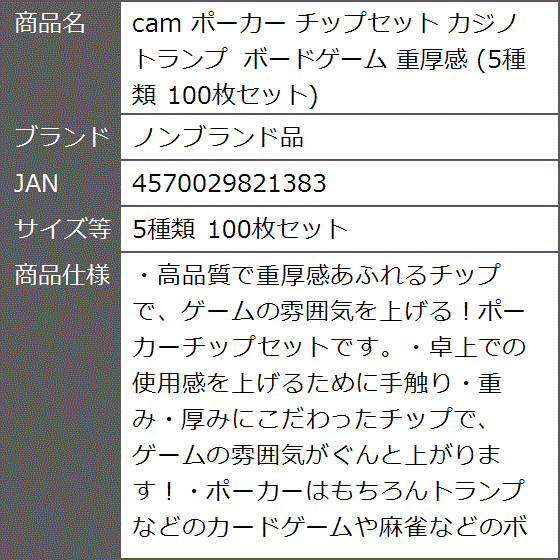 ノンブランド品 cam ポーカー チップセット カジノ トランプ ボードゲーム 重厚感 5種類 100枚セット5種類 100枚セット- メルカリ。