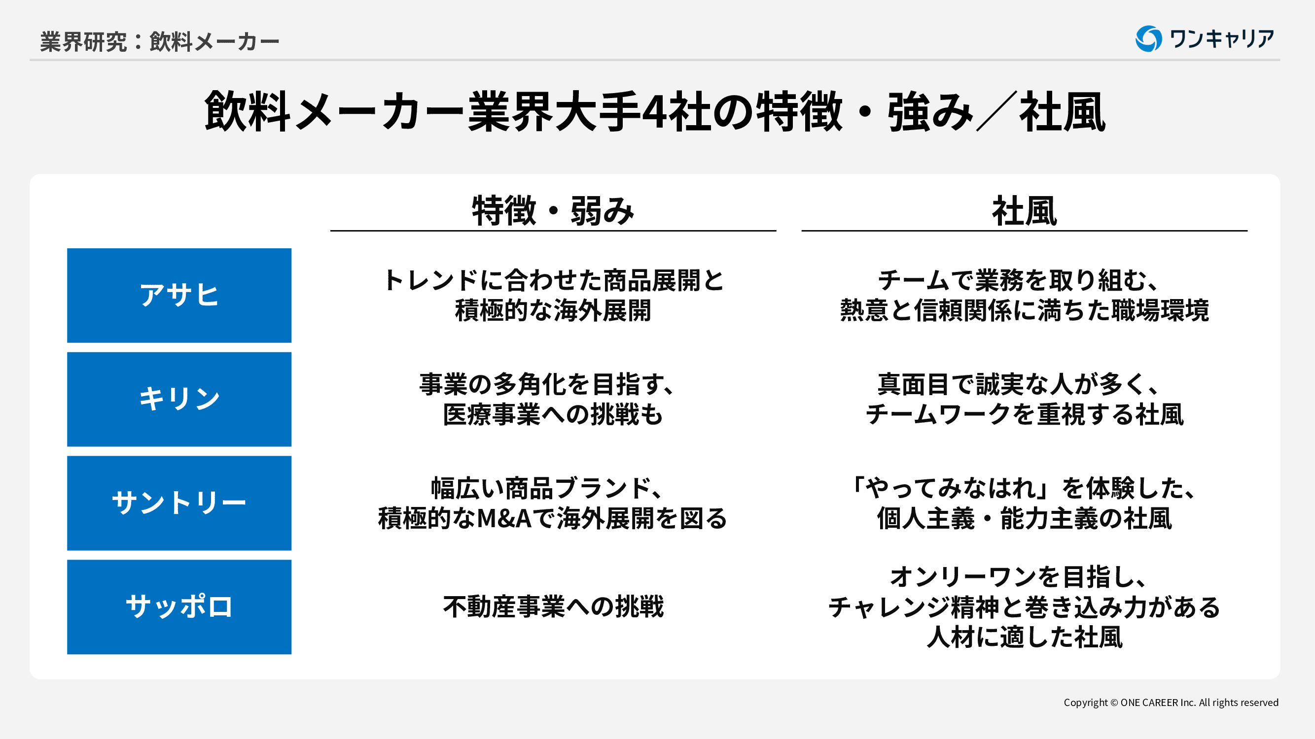 飲料メーカー:業界研究 大手4社「アサヒ・キリン・サントリー・サッポロ」を比較!業績ランキング・平均年収・社風 強みの違い就活サイト ワンキャリア。