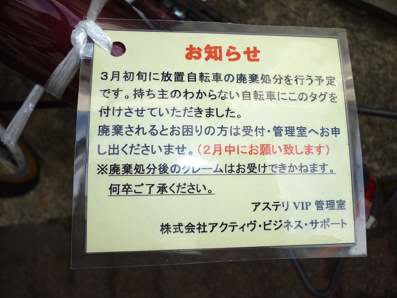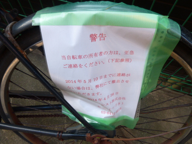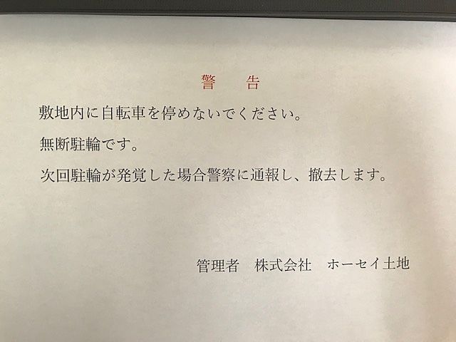 置き去りの自転車警告文賃貸管理・アパート管理・不動産売却なら大田区の不動産会社ライフアシスト株式会社。