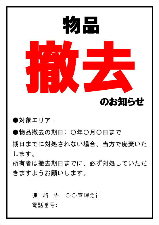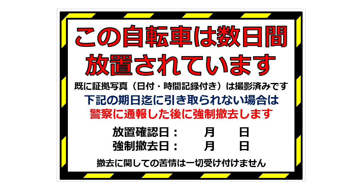 撤去の張り紙放置自転車&物品撤去を知らせる無料ExcelテンプレートExcel・Word基礎講座とテンプレート。