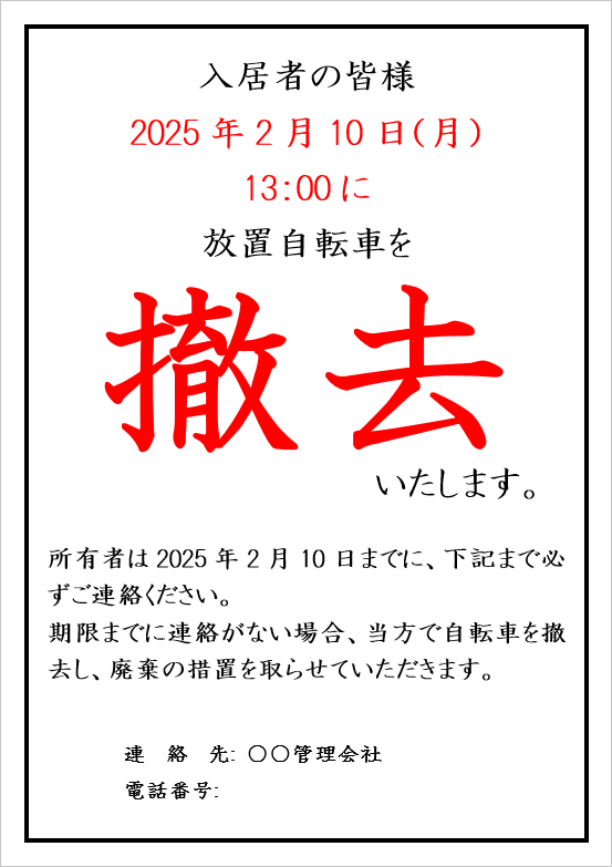 アパートやマンションで使える放置自転車の撤去・処分・警告の張り紙テンプレート📑無料ダウンロード!テンプレルン📑無料ダウンロード!テンプレルン。