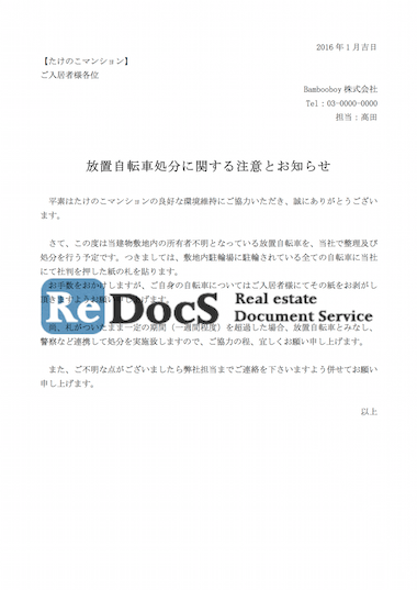 放置自転車に関する注意書式・ひな形・テンプレート賃貸管理ソフトReDocS。