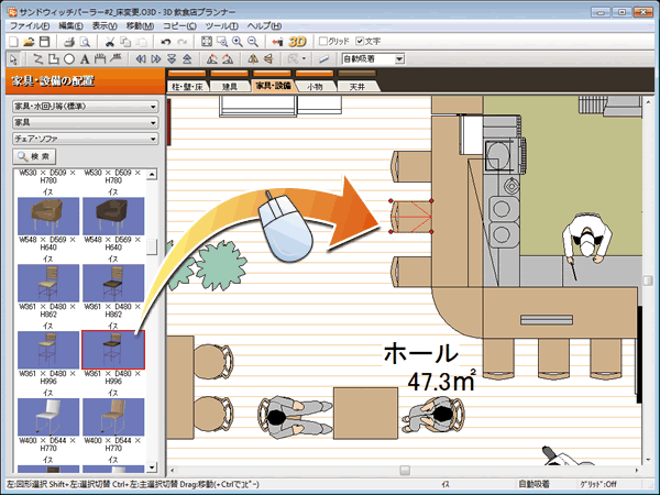 簡単操作で店舗を実現!3Dだから分かりやすい-店舗デザイン・レイアウトソフト「3D飲食店プランナー」。