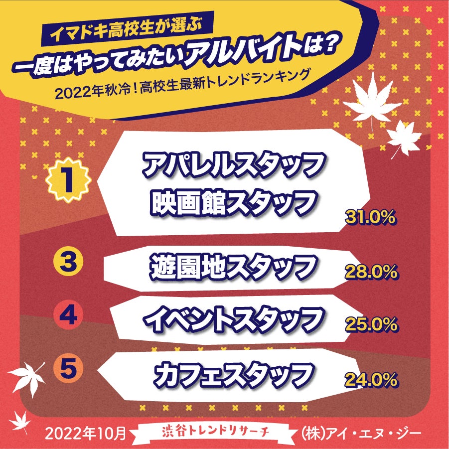 イマドキ高校生の最新アルバイト事情 やってみたいアルバイトTOP10には、"アパレルスタッフ"や今話題の"コンカフェ"などの接客業が多数ランクイン!株式会社アイ・エヌ・ジーのプレスリリース。