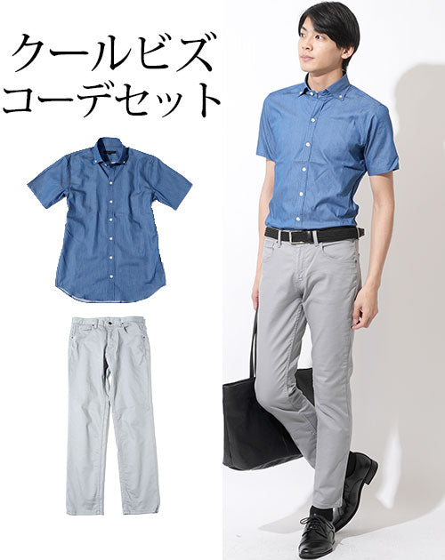 20代メンズクールビズ2点コーデセット デニム半袖シャツ×グレースリムチノパンツ biz。