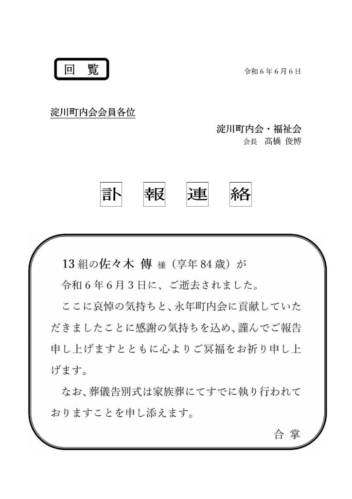 訃報連絡光学区 淀川町内会。
