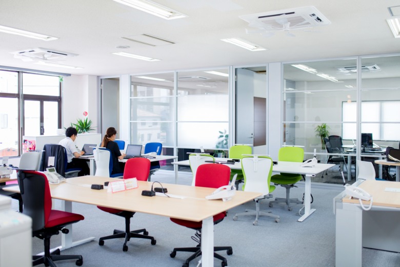 オフィス環境改善の事例紹介:配線整理、間仕切り、システム天井岡山オフィスづくり.com。