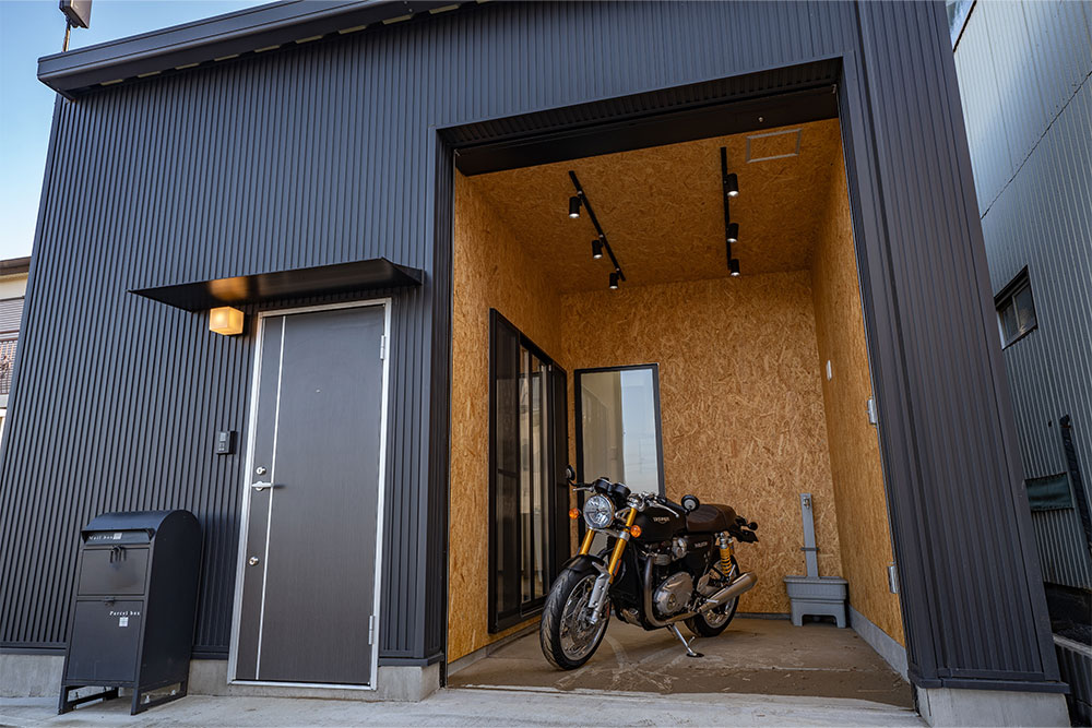 角地に建つ小さな平屋バイクガレージハウス埼玉県川越市。