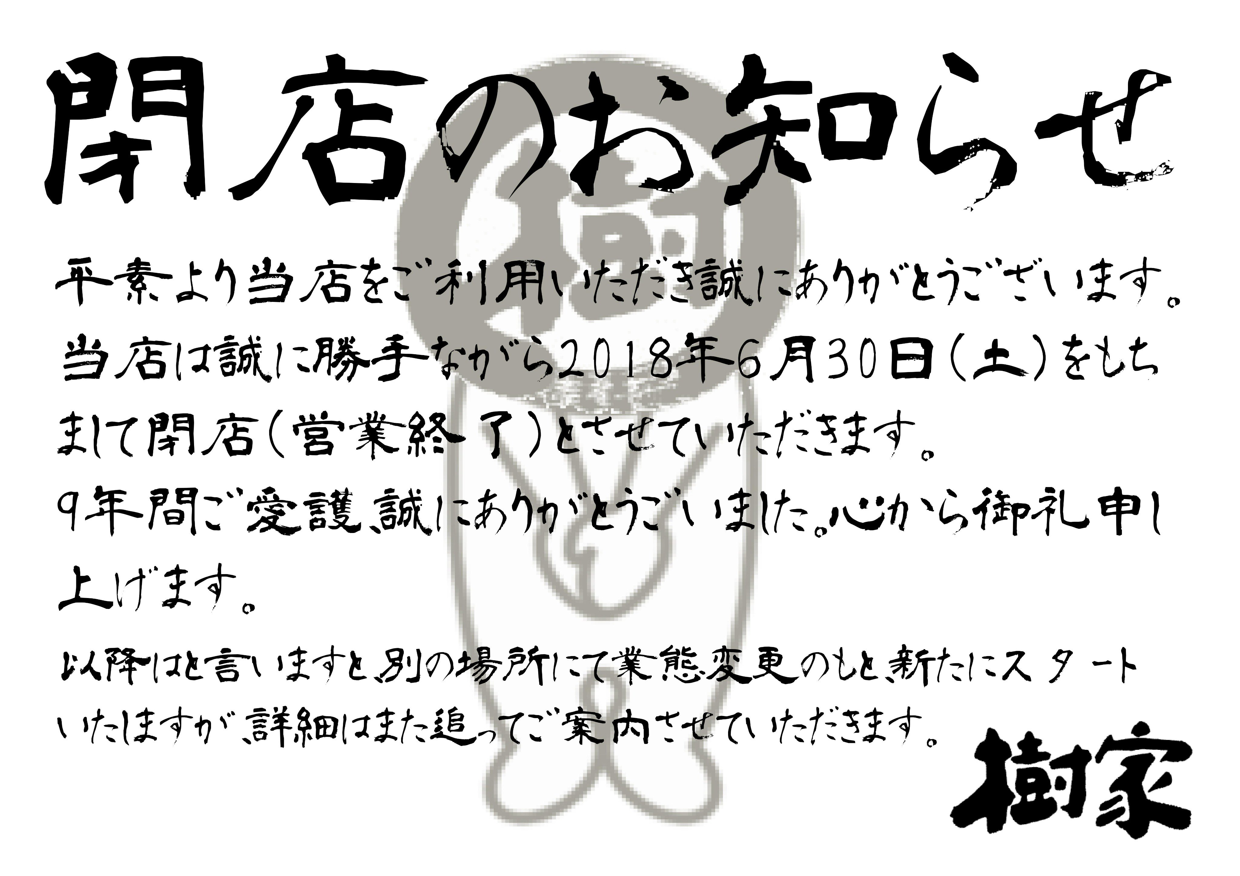 樹家 西池袋 on X: " 閉店のお知らせ閉店前の29日、30日は 『売り切れ御免 食べ飲み放題 2時間1000円』の樹家お疲れ様イベントを考えてますので 来れる方は来てくださいね ^^詳細は、 ちょっと待ってくださいね、、、樹家池袋西口閉店2018年6月30日閉店。