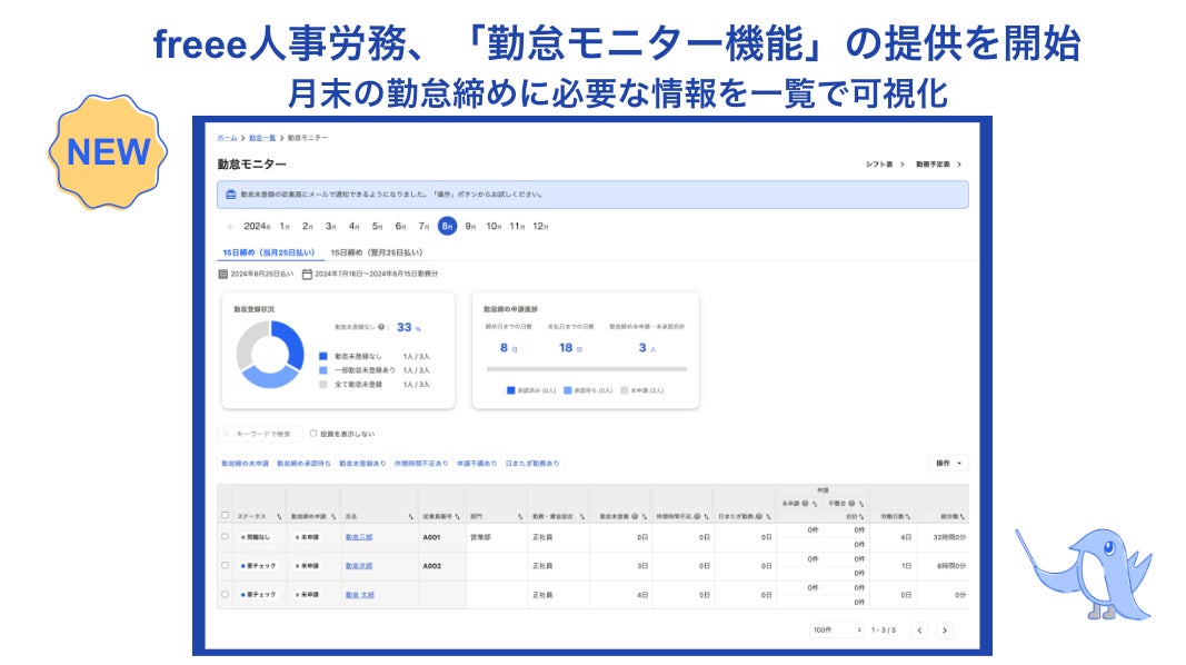 freee人事労務の「勤怠モニター機能」の提供を開始フリー株式会社のプレスリリース。