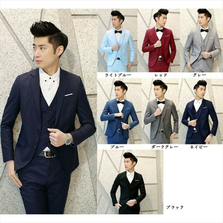 楽天市場 メンズスーツ ベスト付き スリムスーツ フォーマル スーツ リクルート 成人式 卒業式 7カラー 大きいサイズ ライトブルー レッド グレーブルー ネイビー ダークグレー ブラック S M L XL 2XL 3XL dg332f0f0x1 代引き不可 : 発表会ドレス Happysunny。