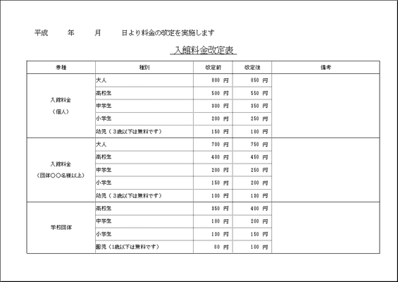 料金改定表Excelで作成した2種類のテンプレートが無料です。