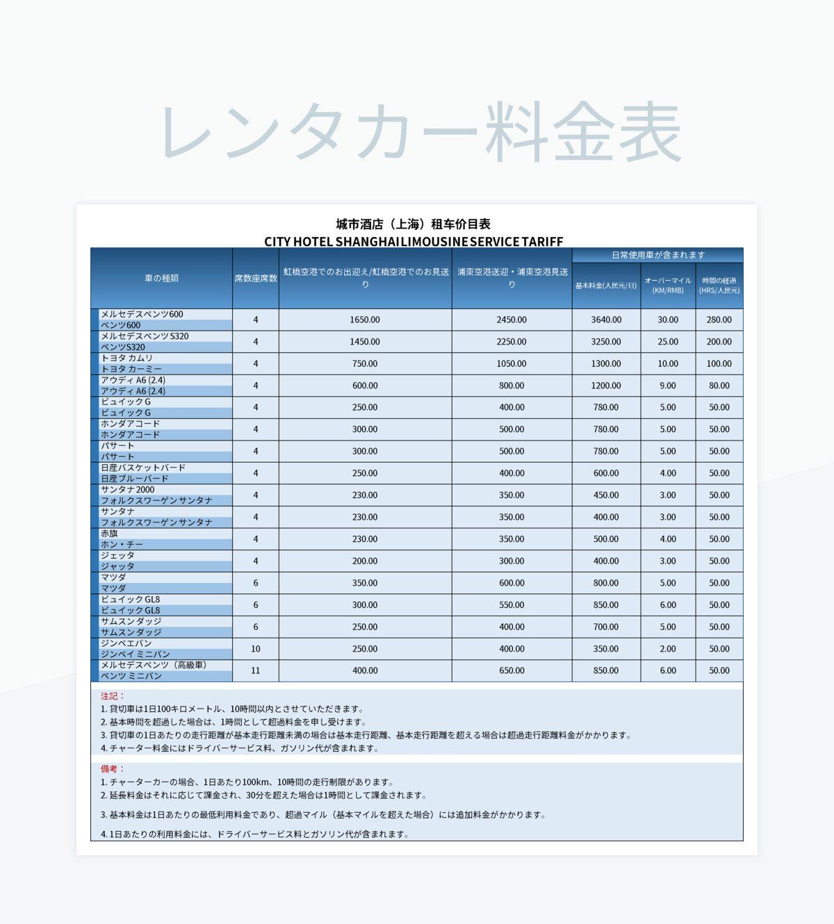 レンタカー料金表 テンプレート 無料ダウンロード - Slidesdocs。