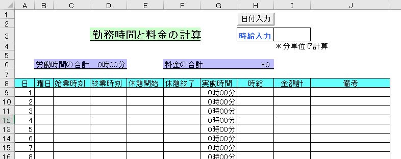 エクセル 勤務時間と料金 テンプレート - エクセルフリー 無料ダウンロード。