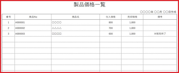 製品価格表 見本・記入例 シンプルな一覧表「pdf-word-Excel」のフリー素材をダウンロード無料テンプレートTemplateBox。