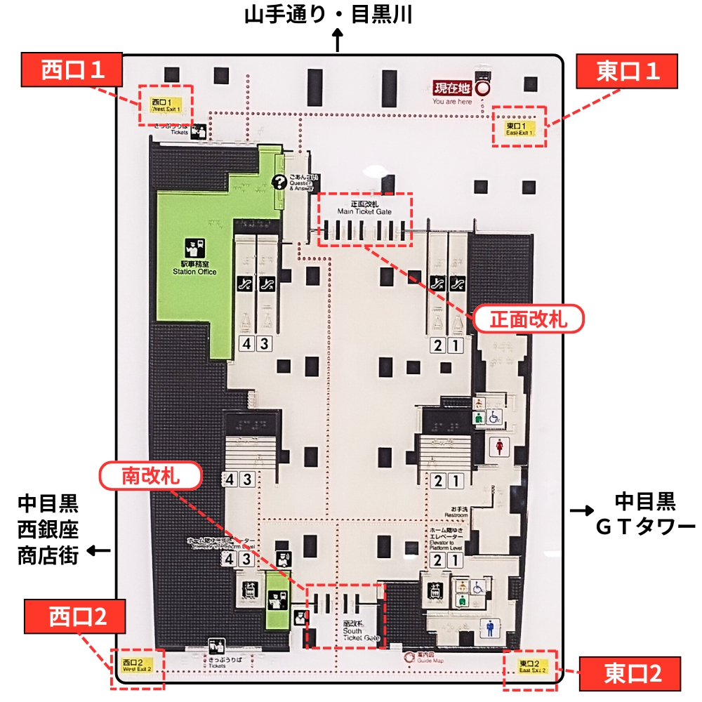 目黒駅:わかりやすい構内図を作成、待ち合わせ場所2ヶ所も詳説!関西の駅ガイド。