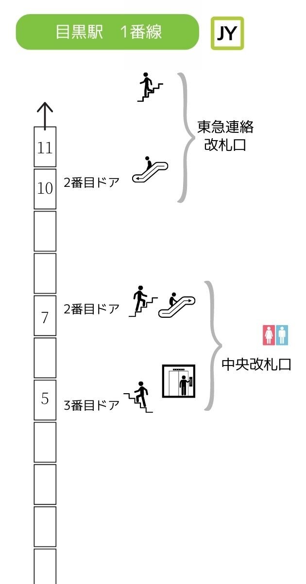 JR目黒駅 山手線ホームの階段・エスカレーター・エレベーターに近い降車位置情報。