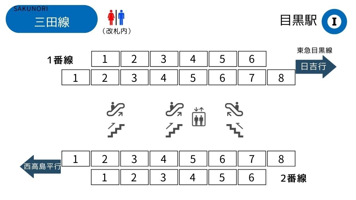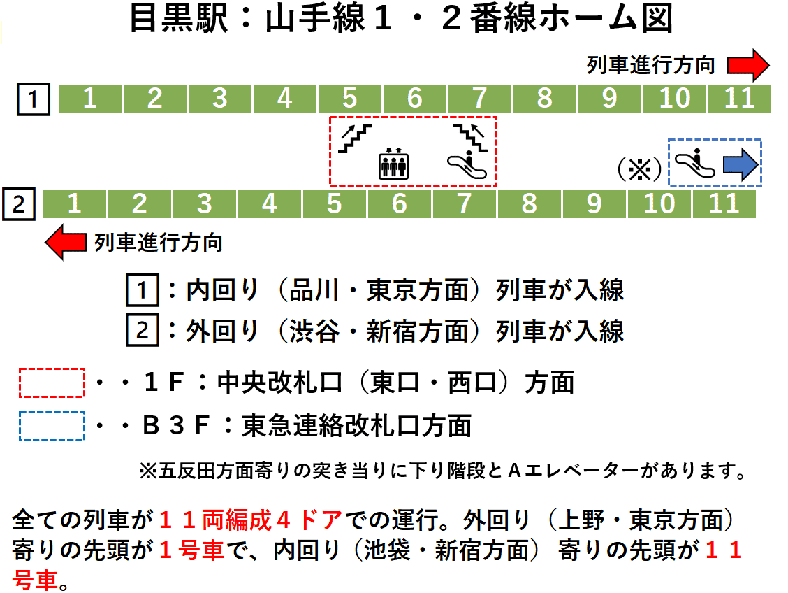 目黒駅 1番ホーム:山手線 内回り 改札・出口に近い乗車位置 - SAKUNORI。