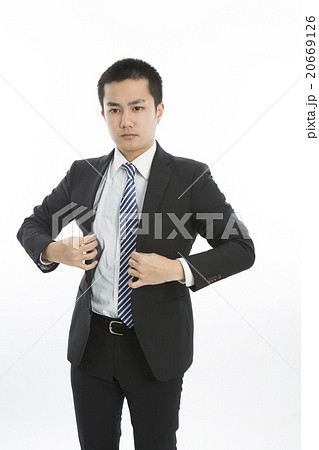 ビジネスマン スーツ 白バック 身だしなみを整える 気合いを入れる 全身の写真素材20669126- PIXTA。