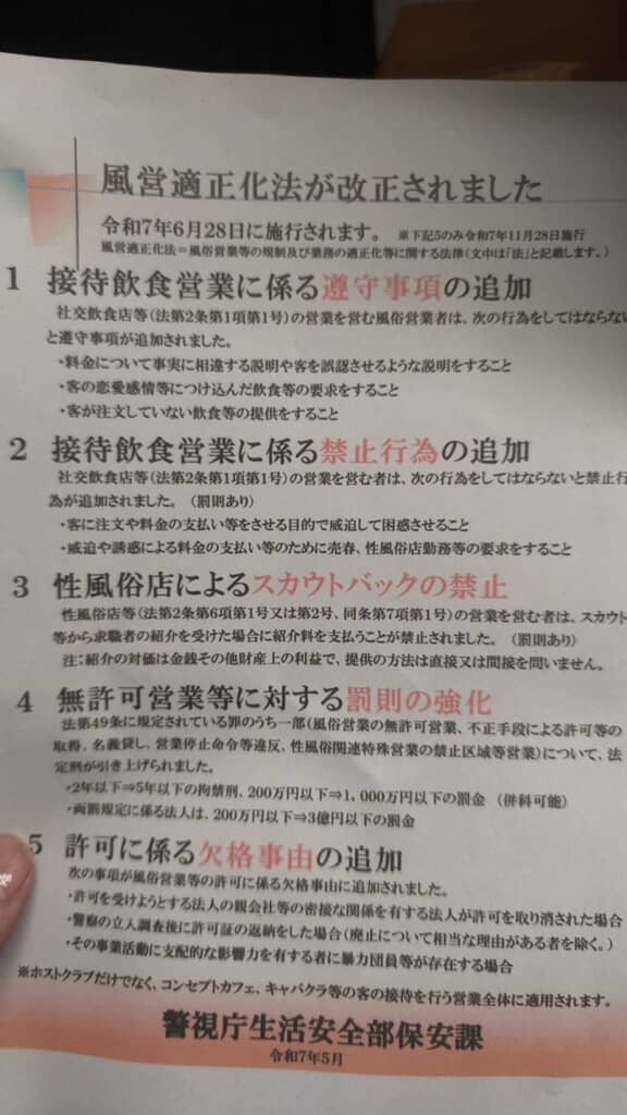 風営法が改定され、歌舞伎町の看板が一部黒塗りに。もちろん悪質な事業者への取り締まりは必要だし、売掛やスカウトバックにメスを入れたことは高く評価するべきだと思います。一方で毎日のラスソンや毎月のランキング、お店での役職に規制をかけることがその対処として。