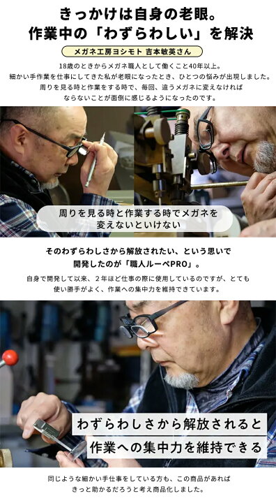 楽天市場 職人ルーペPRO プロ仕様ルーペ メガネ ルーペ 拡大鏡 シンプル スタイリッシュ かっこいい おしゃれ 便利 役に立つ 作業への集中細かい作業 手仕事 ハンドメイド 裁縫 新聞 本を読む 辞書 地図 読書 手芸 工作 福井県 鯖江市 日本製 SABAE メガネ工房ヨシモト。