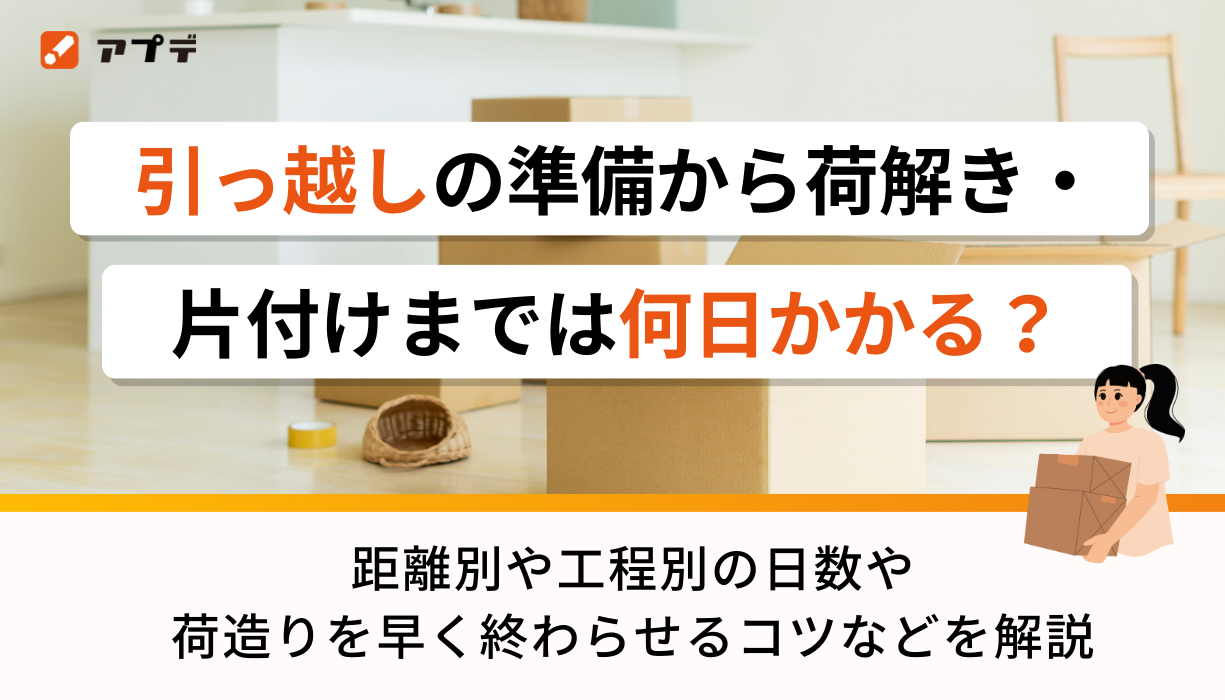 引っ越しの準備から荷解き・片付けまでは何日かかる?距離別や工程別の日数や荷造りを早く終わらせるコツなどを解説アプデ。