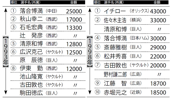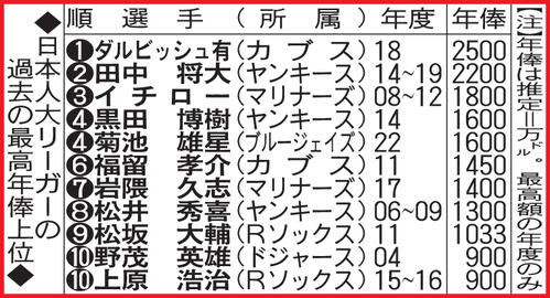 日本人大リーガーの過去の最高年俸上位 一覧 - MLB : 日刊スポーツ。