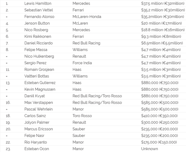 F1ドライバー年俸ランキング: 2017年F1ドライバー長者番付 : F1通信。
