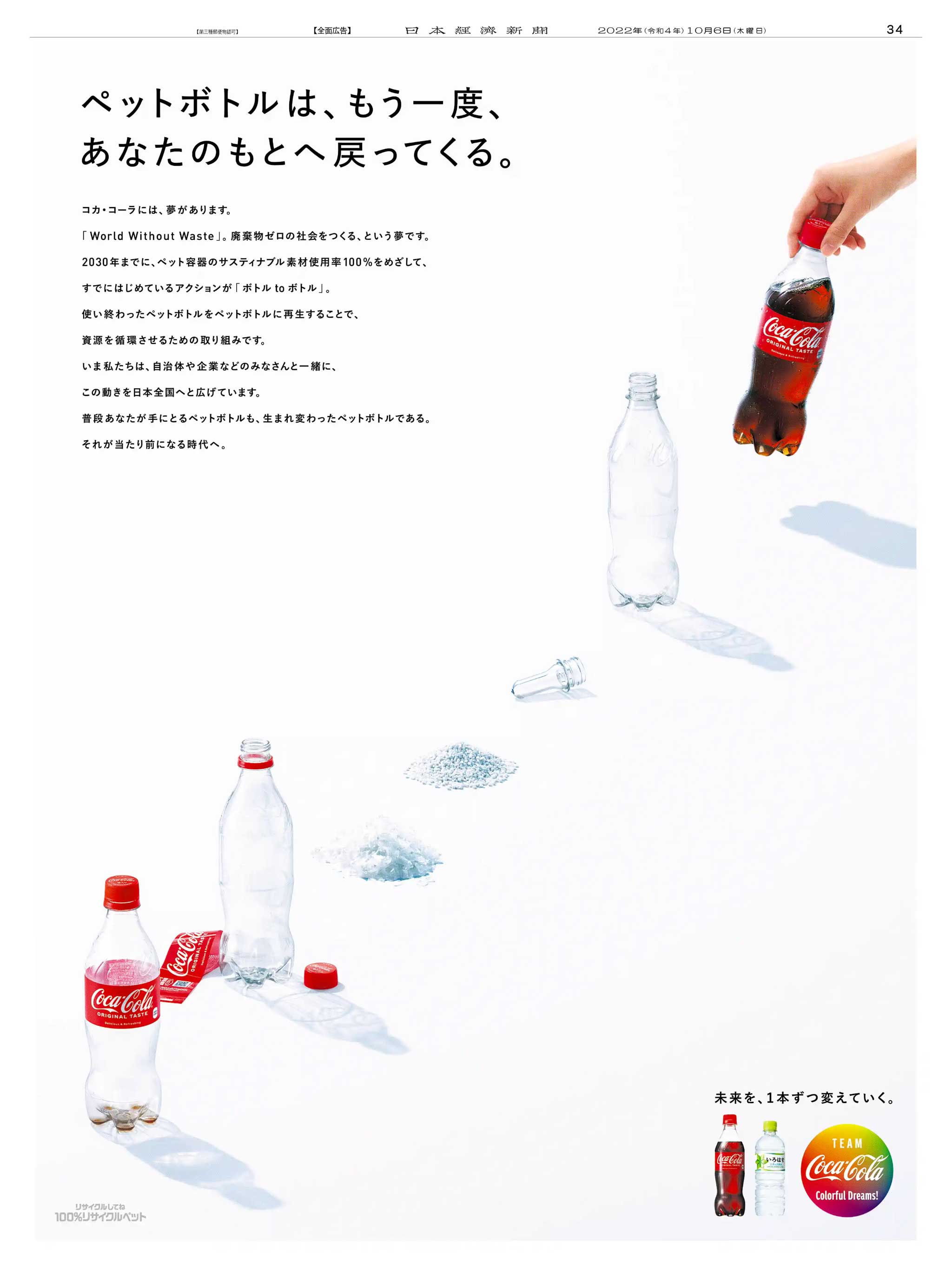 コカ·コーラ社製品が、さらにサスティナブルに。「コカ·コーラ」、「ジョージア ジャパン クラフトマン」などの旗艦製品が2021年5月31日より100%リサイクルPETボトルで登場日本コカ・コーラ株式会社のプレスリリース。