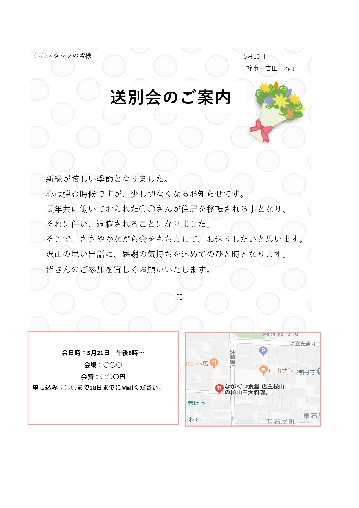 転職・移動に送る側の送別会の案内状「社内・社外・例文あり」💗無料ダウンロード「かわいい」雛形・テンプレート素材。
