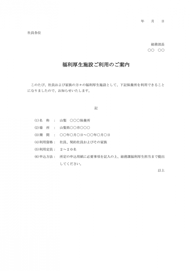 福利厚生施設の社内周知の書式文例――Wordファイルを無料ダウンロード│無料ダウンロード『日本の人事部』。