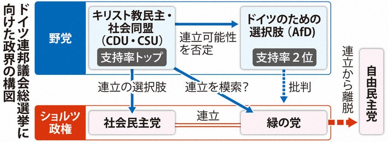ドイツ:次期連立は? ドイツに動き 2月総選挙へ 最有力CDU「両にらみ」毎日新聞。