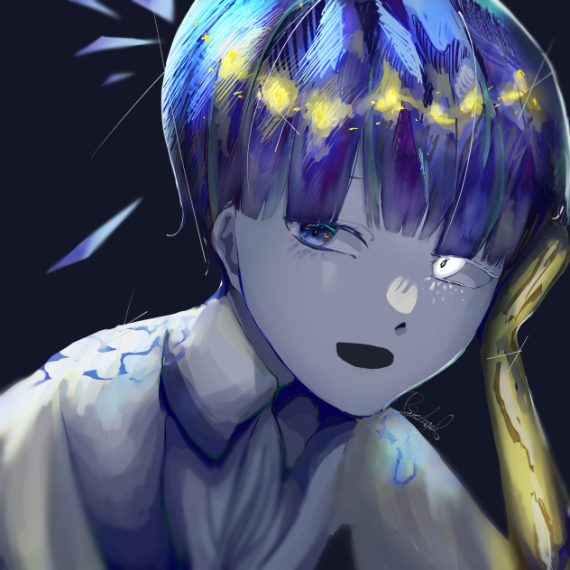 ラピスラズリの頭部のフォス宝石の国 のラピフォス をアート的に描きました 以前の足だけのフォスとシリーズかも 合金も宝石の髪と同じく難しいけど楽しいテーマですねTwitterのタグ企画に載らせて頂きました 💎 💎 💎 💎 housekinokuni_fanart。