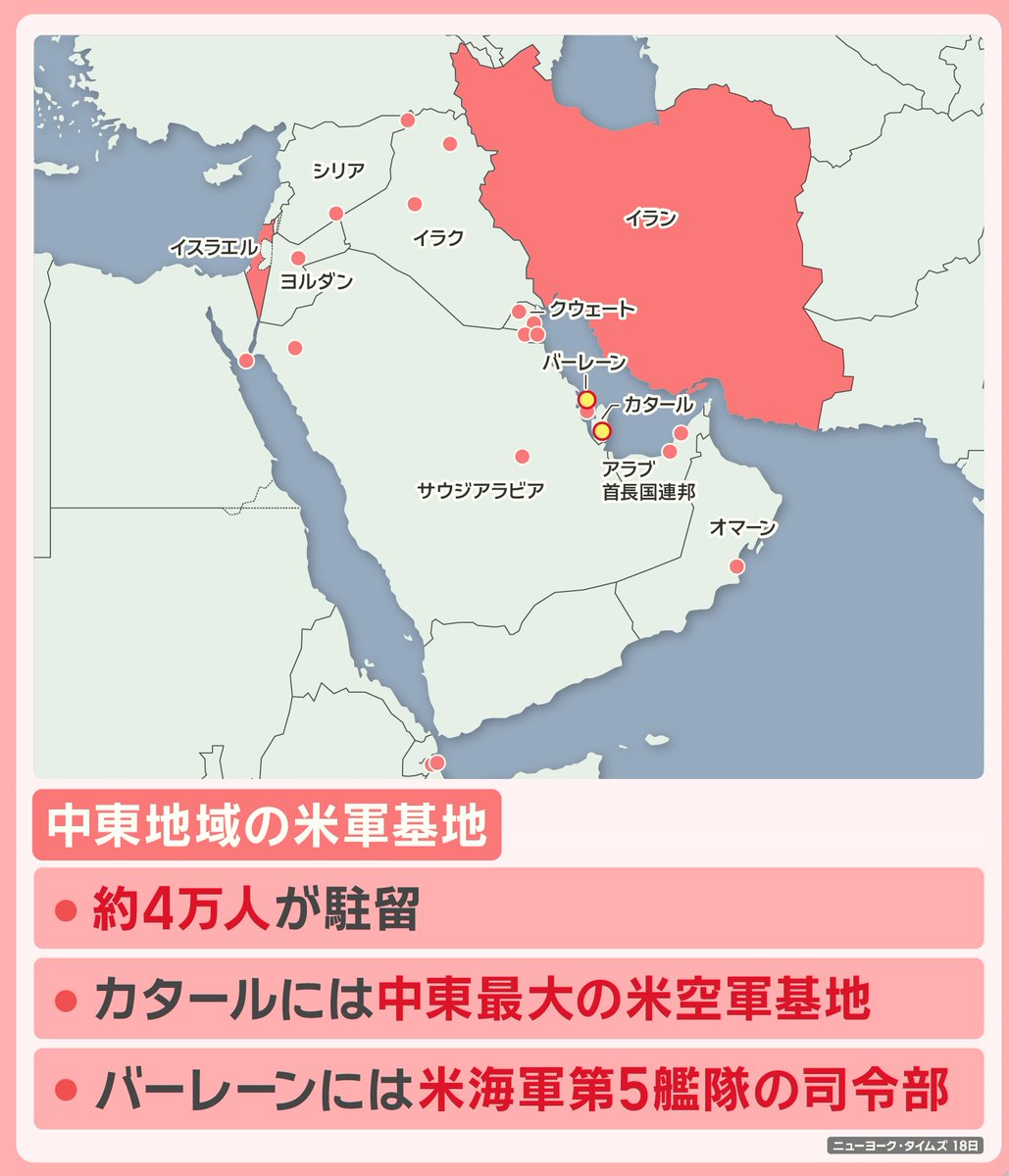 羽鳥慎一モーニングショー on X: "中東地域の米軍基地は各地に点在していて、約4万人の軍関係者が駐留しています。 カタールには中東最大の米空軍基地、バーレーンには米海軍第5艦隊の司令部など、規模の大きな基地もあります。https:t.co Lgzy6NfJvh"X。