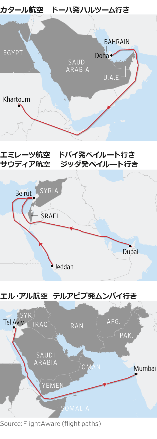 深刻化する中東の分裂、ジグザグ航空路に投影 - WSJ。