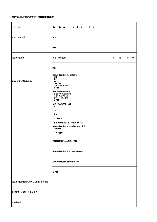 ハラスメントヒアリングシート 被害者・相談者用 のテンプレート――Excelファイルを無料ダウンロード│無料ダウンロード『日本の人事部』。