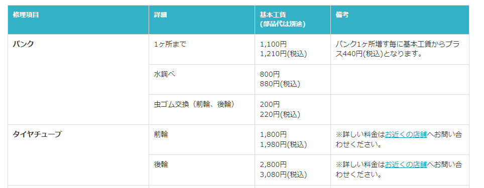 自転車修理工賃サービス一覧サイクルベースあさひ。