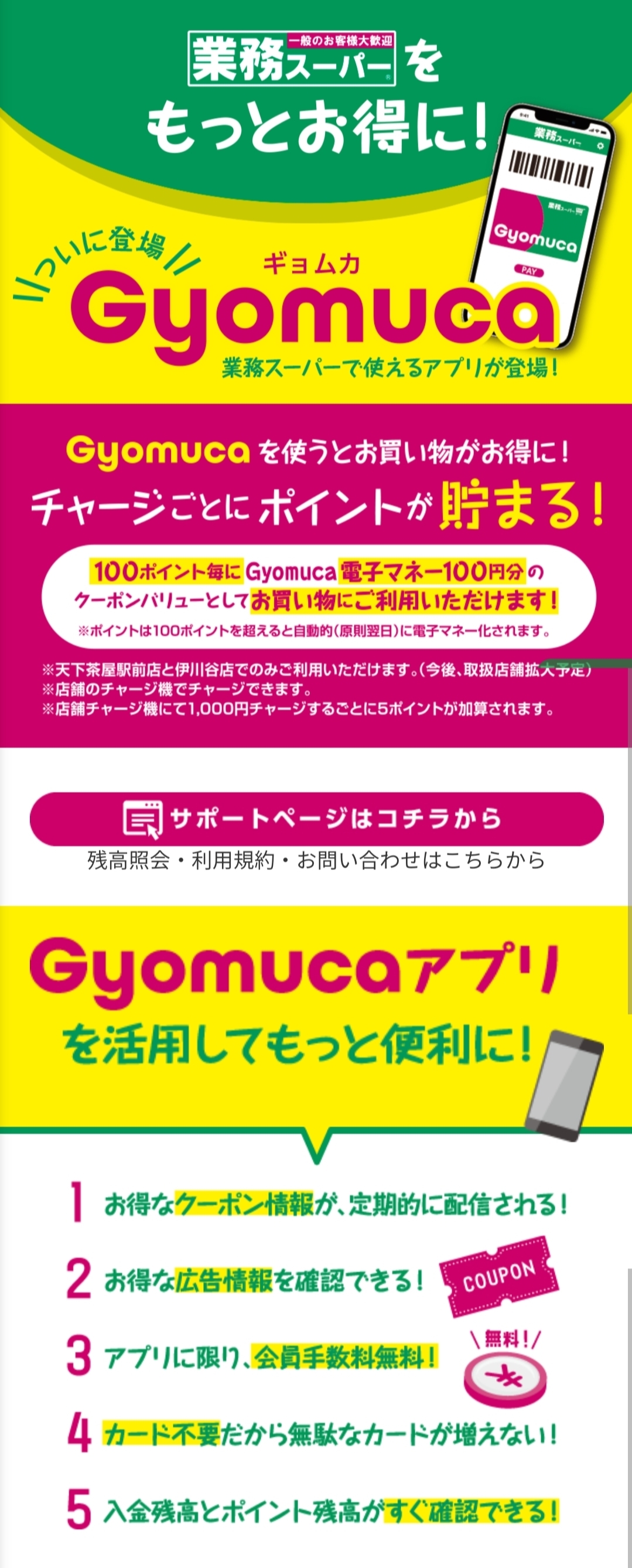 近木裕哉 on X: "おととし東京にも使える店舗できてアプリなら無料なのに面白いからとあえて発行100円かかる実物カード作った業務スーパーのプリペイド電子マネーGyomuca🛒入金1000円ごとに5円ぶんポイント還元なんだけどついに100円ぶん貯まりそのお代を回収。長かった。