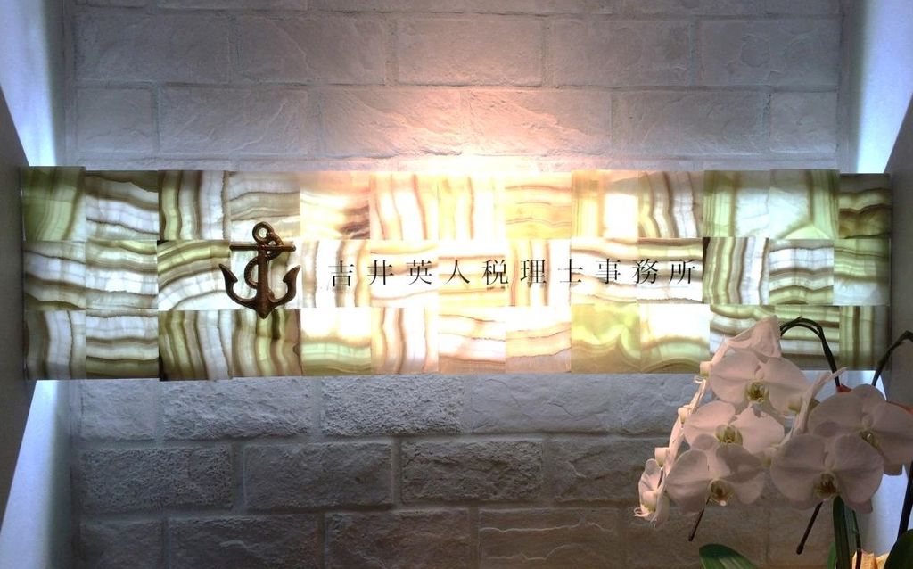 会社名のみ、長方形で囲んだ中に白抜きで記載したきちんとした印象の中に個性が光るデザイン。名刺作成・印刷やデザインならBUSINESS名刺印刷所。
